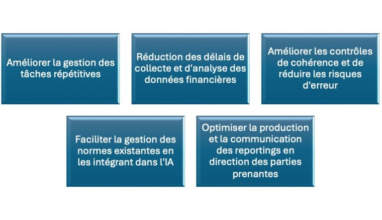 Aujourd’hui, les directions financières mettent l’accent sur la possibilité de déployer des outils de production et de reporting qui intègrent l’IA sur l’ensemble du processus d’établissement des états de reporting. Aussi, particulièrement pour le service de consolidation avec tous les projets de changement d’outils qui se profilent à la suite de l’annonce de SAP BFC de mettre fin à la maintenance de son outil à l’horizon 2030, c’est une opportunité pour les directions financières, notamment le service de consolidation, de se tourner vers des outils qui intègrent l’IA. L’objectif sera de :